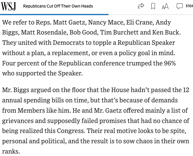 可以参考WSJ的社论,“八人中的比格斯议员在众议院辩论中表示,众议院没有按时通过12项年度开支法案,这也是支持八议员的许多人的说法。但实际情况恰好是像他这样的议员导致的。他和盖茨议员提出了一长串的不满意又注定失败的承诺,这在本届国会没有任何机会实现。他们的真正动机似乎是出于恶意,既有个人恩怨成分又有政治动机,其结果是在自己的阵营中制造混乱。”
