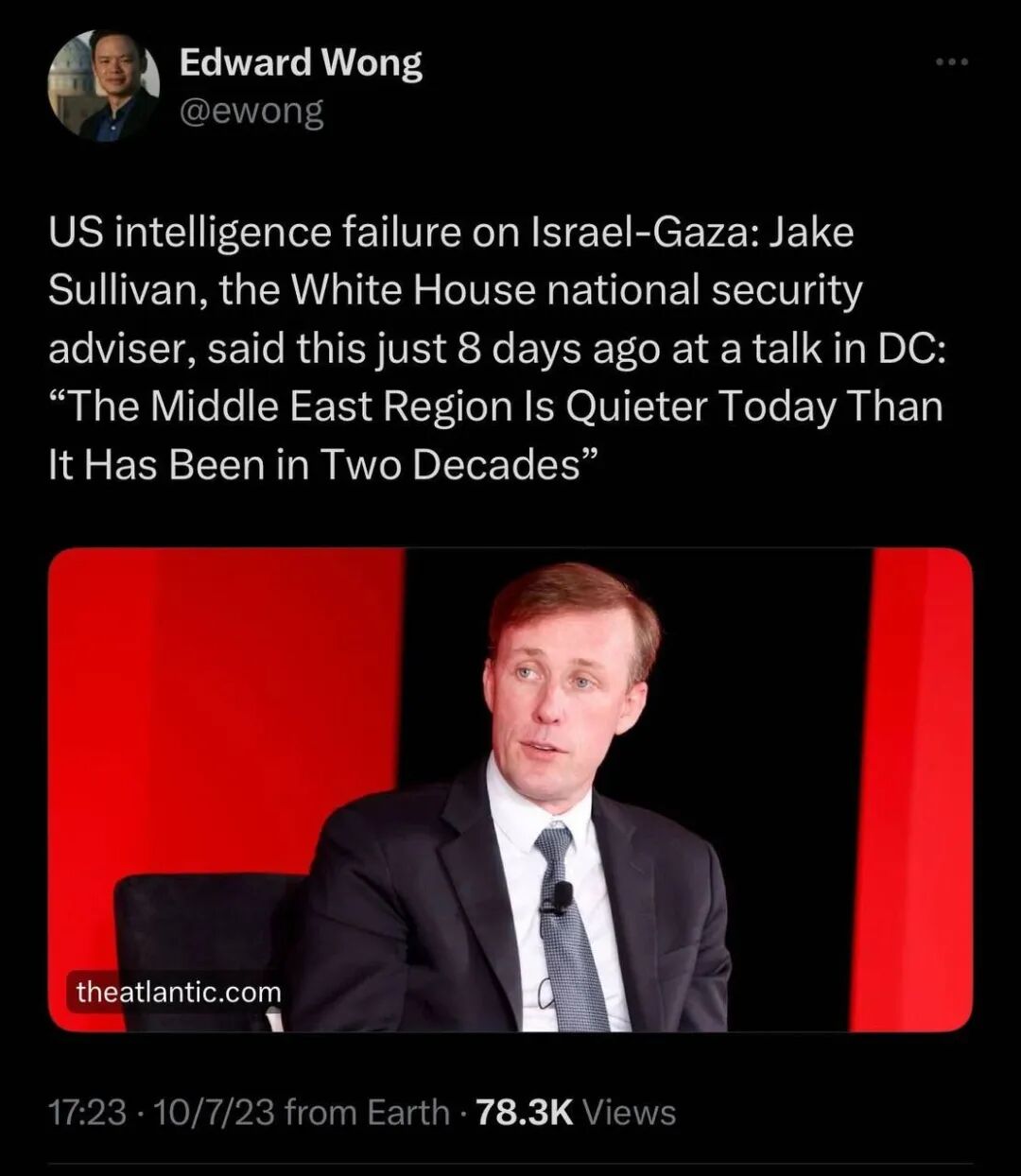 而美国白宫首席情报顾问苏利文8天前在华盛顿宣称:“现在中东地区处于20多年来最和平宁静的阶段”,更是充分曝光了作为以色列头号盟友的美国的情报严重失误。