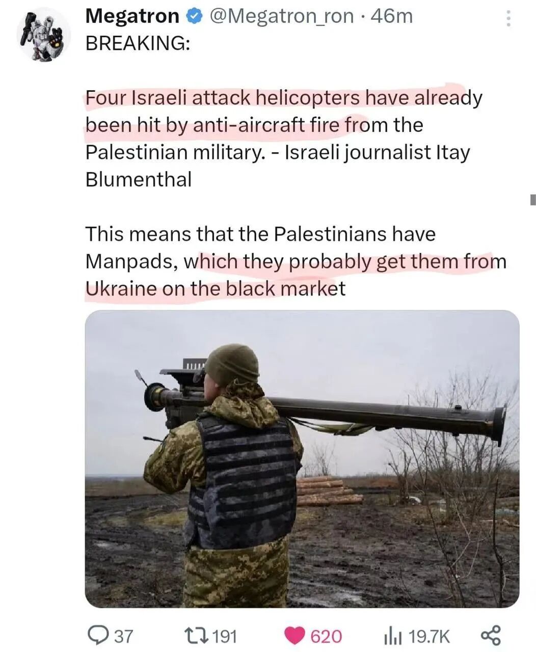 这个担忧已经在今天的战事中得到验证,据来自以色列记者Itay Blumenthal的报道,“4架以色列战斗直升飞机被巴勒斯坦军方反战机导弹击落”。引起了对于巴勒斯坦方可能通过黑市获得类似标枪导弹这类武器的担忧。