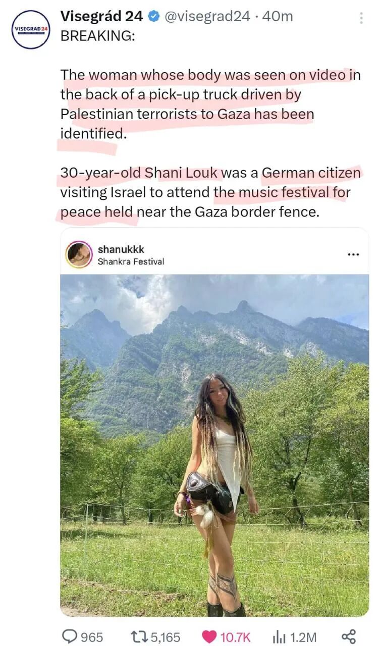 但是有推特大V确认,死者真实身份是一个德国去加沙边境墙参加音乐会的30岁女性。从照片、视频中的身材尤其发型对比看,这个消息的可信度非常高。那么听起来,完全不能排除可能是白左误闯禁区被俘虏杀害了。类似“用爱发电”的歌舞升平,真能阻止恐怖分子的野蛮凶残?——什么时候这种无知者无畏的悲剧能停止。
