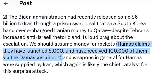 骨牌效应并不局限如此,拜登政府送了60亿美元的求和费给伊朗,根据美国智库机构胡夫研究所的专家维克多·戴维斯·汉森(Victor Davis Hanson)的X(前推特)一个高达200万阅览量的贴文曝光,伊朗还获十万枚火箭导弹作为条件。这很可能是这次突然袭击的主要催化剂。
