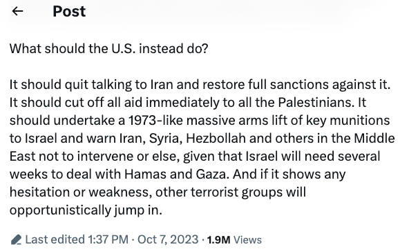 扭转关键也在美国,以汉森博士为代表的智库学者给出了解决方案,“应该停止与伊朗的对话,并恢复对其全面的制裁。应该立即切断对巴勒斯坦的所有援助。应该像1973年那样,大规模提供关键军火支援以色列,并警告伊朗、叙利亚、真主党等中东国家不要干涉,否则以色列将需要数周来应对哈马斯和加沙。如果表现出任何犹豫或软弱,其他恐怖组织将机会主义地介入。”