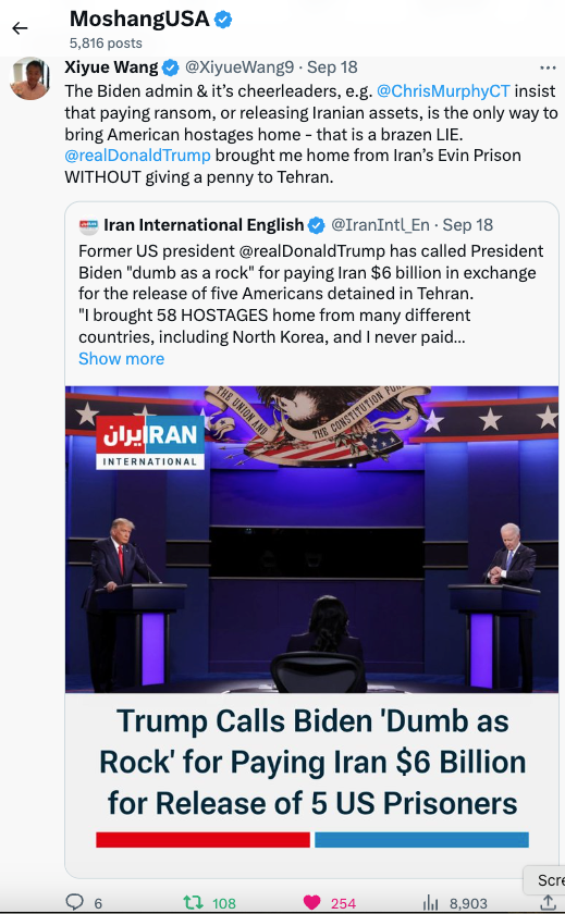 笔者曾经转发王博士在9月18日的一则X(前推特)文,“拜登政府及其支持者,例如@ChrisMurphyCT,坚称支付(60亿美元)赎金或释放伊朗资产是将美国人质带回国的唯一方式,这完全是个厚颜无耻的谎言。@realDonaldTrump 从伊朗的伊万监狱将我带回家,而没有给德黑兰支付一分钱。”