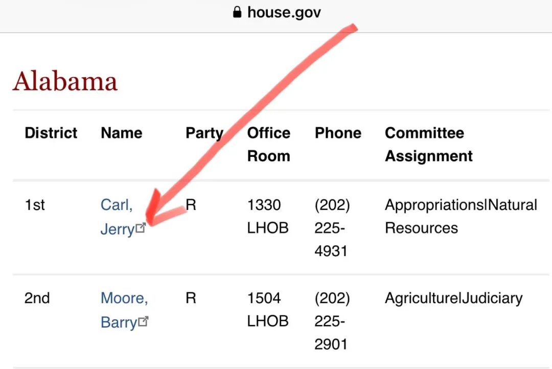 按照图中箭头所示,点击右上小图标进入议员的主页,找到contact下面发email的页面,给您的议员发邮件。