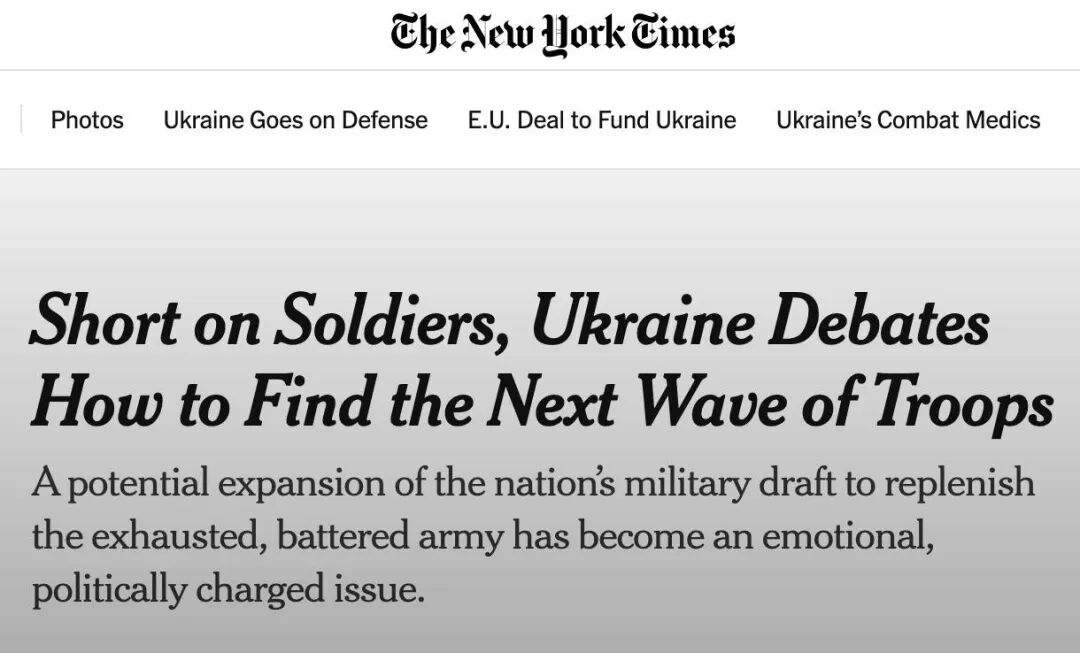 最近NYT也承认乌克兰面临征兵荒,标题“缺士兵,乌克兰正在辩论怎么寻找下一波的兵员”。这事也是个现实问题,“Ukraine currently drafts men between the ages of 27 and 60. Under martial law, all men 18 to 60 are prohibited from leaving the country, lest a decision be taken to draft them.”