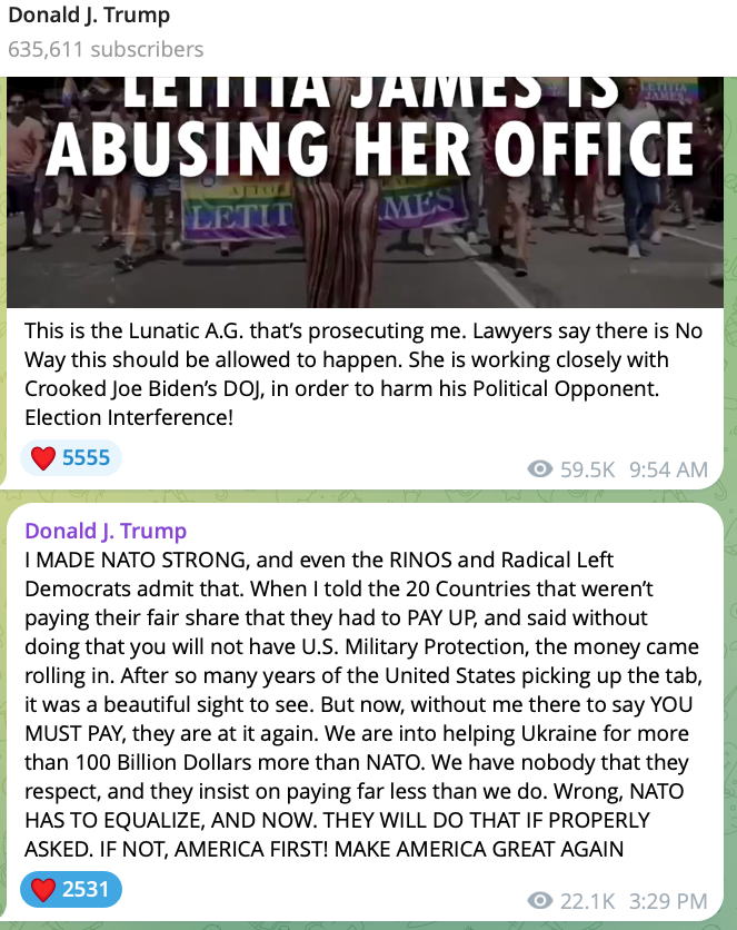 我们在向乌克兰提供援助上已经超过北约1000亿美元。他们没有人尊重我们,他们依然坚持比我们少付很多钱。错了,北约必须实现平衡,现在就是时候了。如果恰当地提出要求,他们将会这样做。如果不配合,那么就美国优先!让美国再次伟大”
