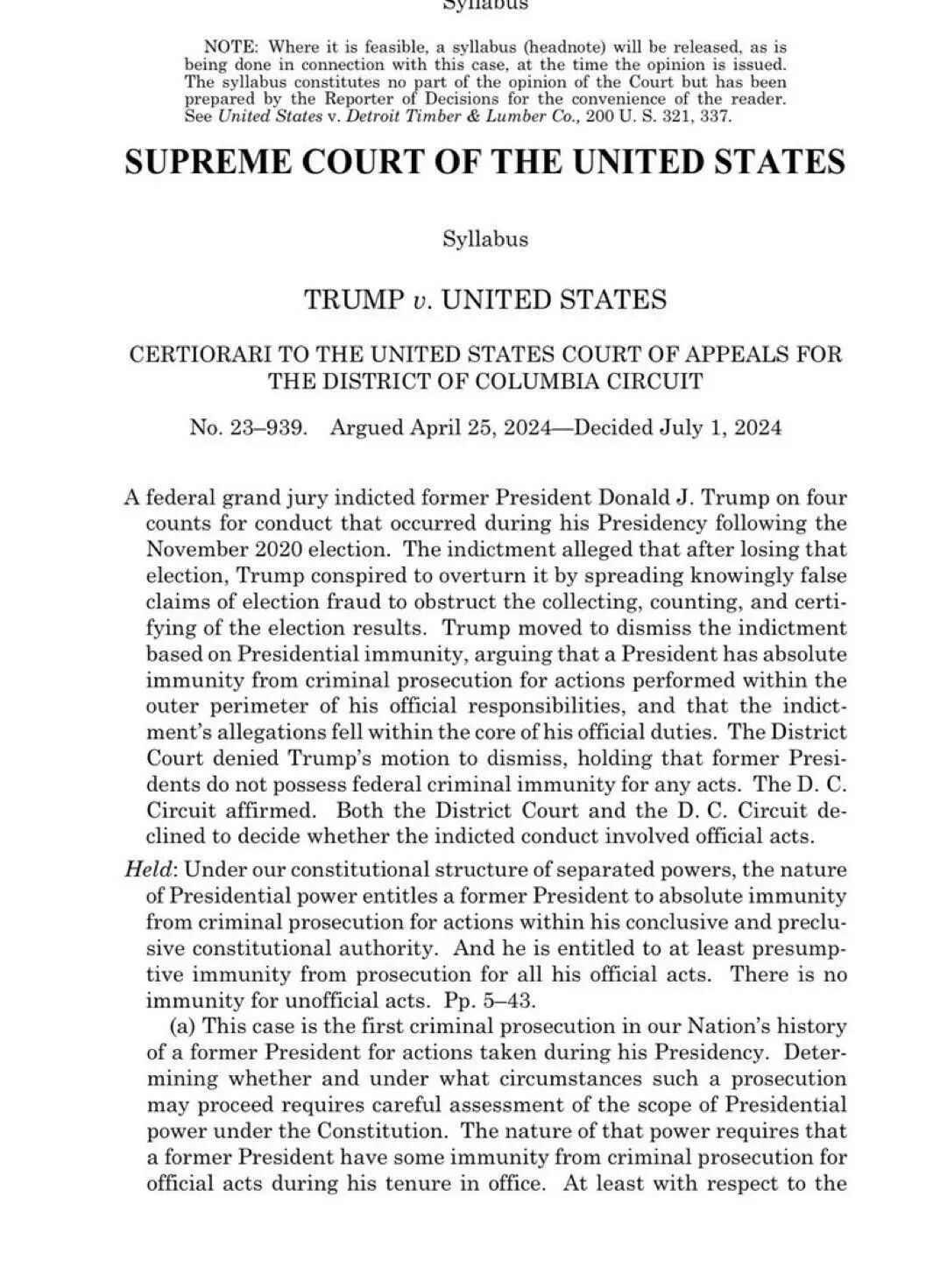 The president “may not be prosecuted for exercising his core constitutional powers, and he is entitled, at a minimum, to a presumptive immunity from prosecution for all his official acts,” Chief Justice John Roberts wrote for the court, joined in whole or part by Justices Clarence Thomas, Samuel Alito, Neil Gorsuch, Brett Kavanaugh and Amy Coney Barrett.- WSJ