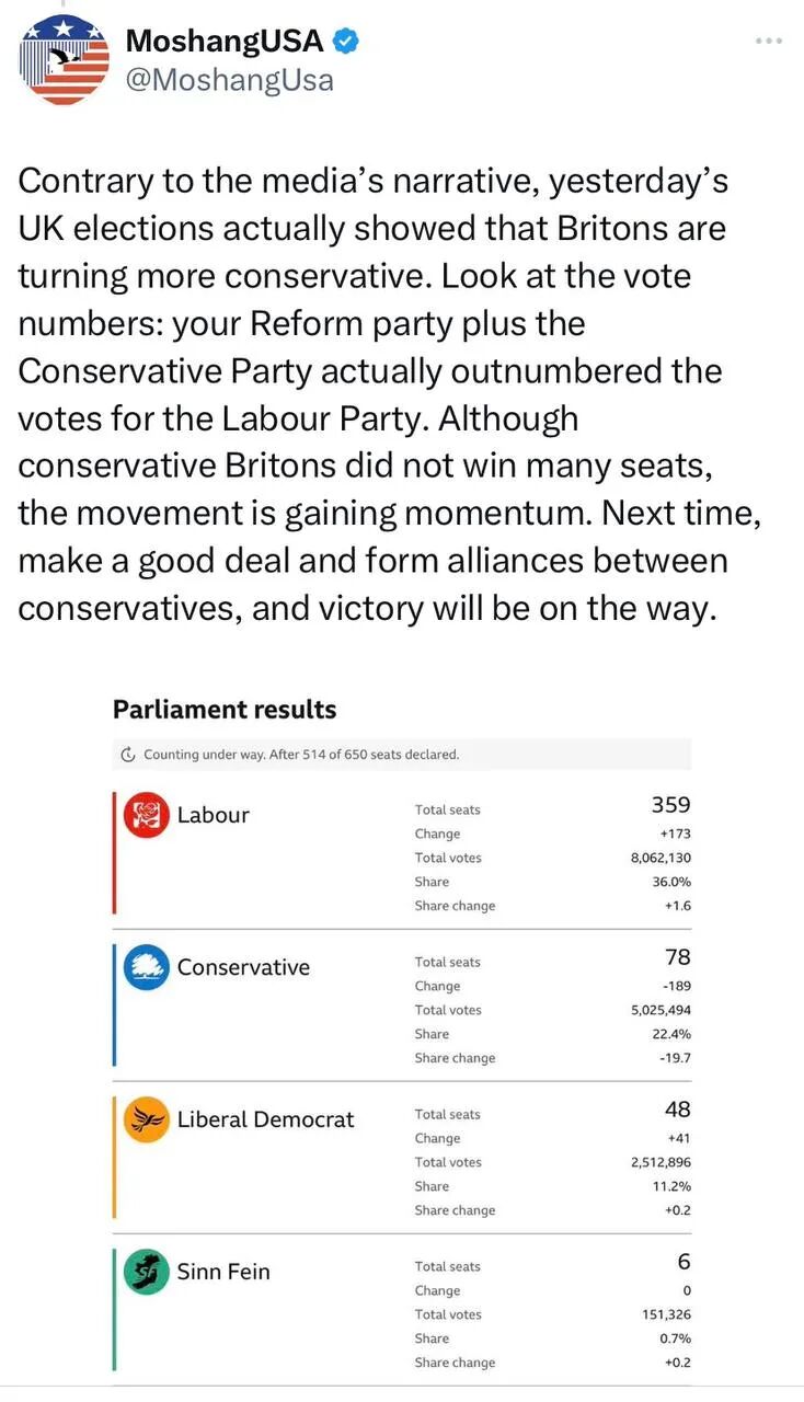 就最近UK和法国的大选,我们在电报群讨论了一下。英国Tory党和Reform党的选票总和其实比左翼的Labor party多了几十万。UK的reform党看起来在关键摇摆选区全部拿到足够份量的分票,所以保守派在这些地方全输掉了。估计本质上也是几万摇摆票决定了大局。