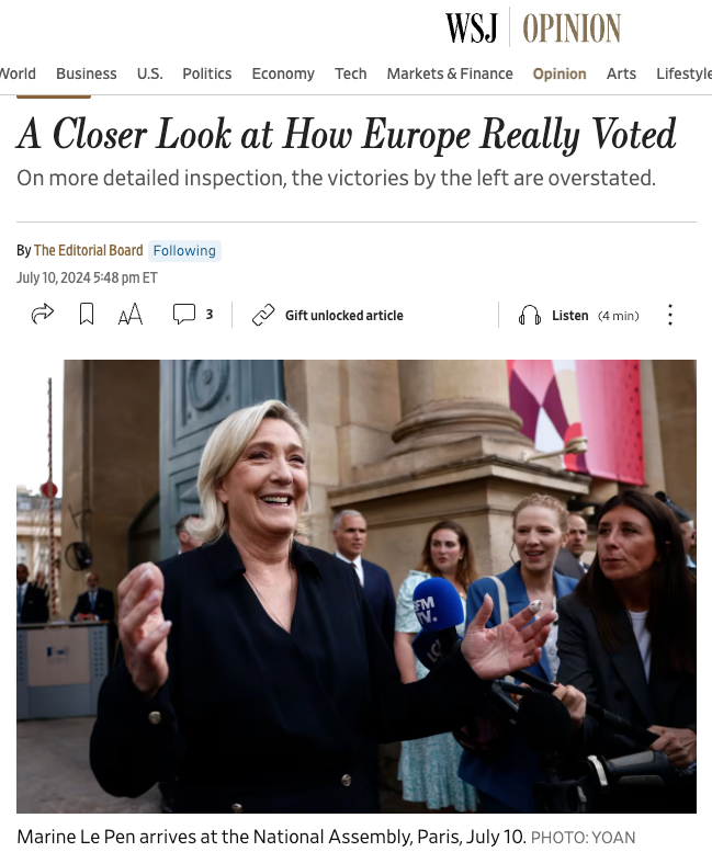 WSJ今天有篇编辑部社论恰好点评了UK和法国的选举,分析了英法保守派现在得票不得席位的现象,翻译分享给大家。