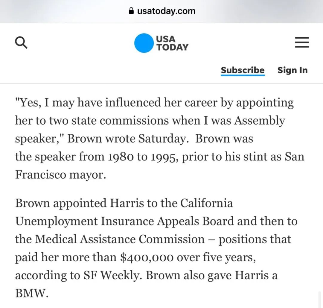 Brown亲口承认自己帮贺锦丽得到加州政府部门两个高薪工作。几年之间就有好几十万美元收入进账,那还是30年前的物价。而她其实并没有相关的工作背景。Brown还给贺锦丽送名车,美国加州版宝马女一枚。