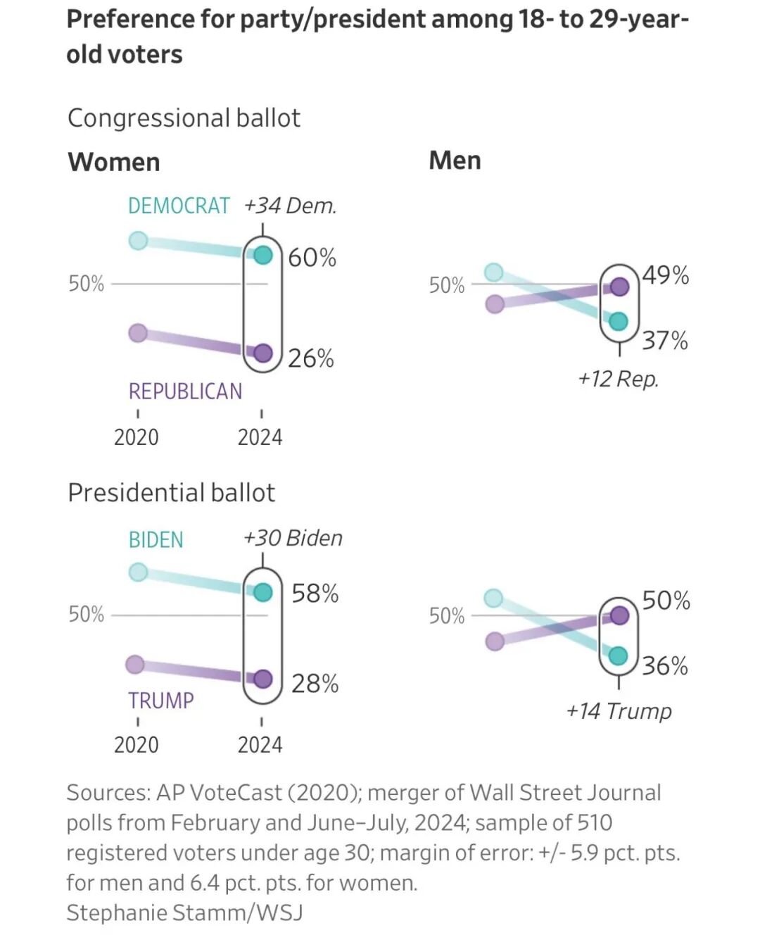 这本是共和党候选人最难争取的一个选民群体,因此这个转变也意味着,美国男性各年龄段全面一边倒地挺川。