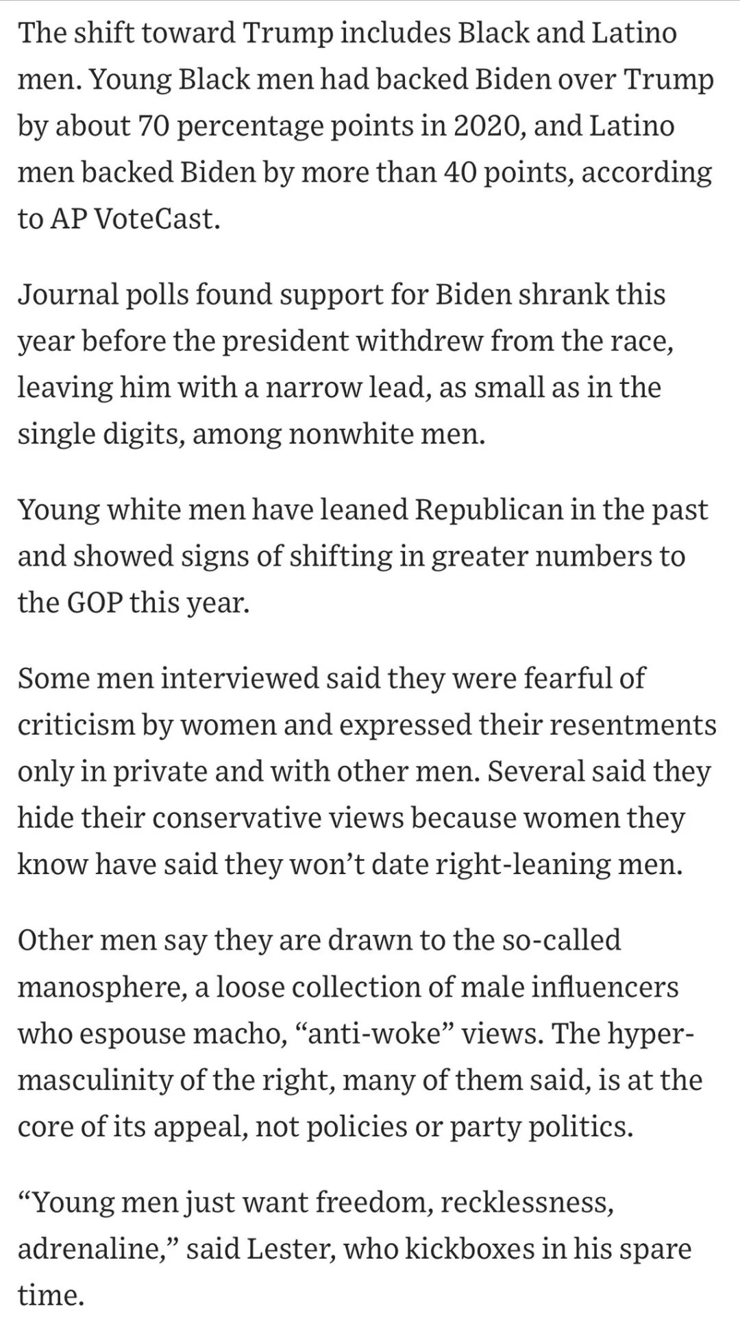 这个报道里还提到,黑人、西裔男性也大幅度右转,从以前民主党获得几十个百分点的支持优势,已显著降低到个位百分比的差距之内。