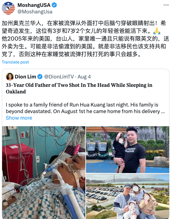 补充一个最新加州奥克兰发生的悲剧,一位叫Run Hua Kuang的男子,在家被流弹从外面打中后脑勺穿破眼睛射出!希望奇迹发生,这位家里的顶梁柱,有3岁和7岁2个女儿的年轻爸爸能活下来。🙏