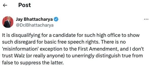Walz公开发表过政府可以以处理所谓的“错误信息”和“仇恨言论”为理由,进行言论封杀的主张。这完全是宪法第一修正案的法盲。即使是一惯好脾气的知名斯坦福教授Jay Bhattacharya也就此提出批评,站出来反对他。