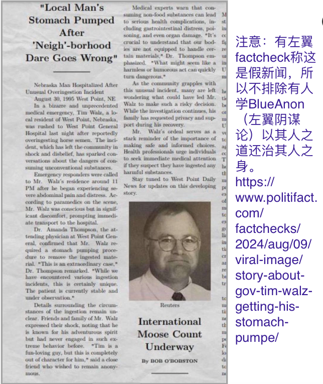 Walz被媒体以中西部农村长大的亲民形象欢呼,试图通过他吸引蓝领选民。不过他是怎么当农民的?他曾经因灌马精液,导致送医院洗胃急救。这事因为太荒唐离奇,还登过报纸。不过在当今美国媒体被民主党全面控制下,已经被左派称造假;或许有人学BlueAnon恶搞。