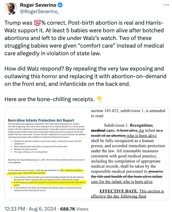 Walz支持极端的堕胎政策,包括婴儿已经完全成形的孕晚期堕胎。在他治理明州的期间,至少有五名婴儿在堕胎失败后活着出生,却被遗弃致死。其中两名挣扎中的婴儿得到的是“安慰护理”而非医疗护理,这是违反州法律的操作。而Walz的回应方式是,他废除了有助于揭露并禁止这种恐怖行为的法律,反而用鼓励随意堕胎和带来导致遗弃婴儿致死风险的法律取代。
