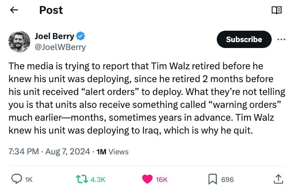 除了上面这些激进的极左政策,Walz作为国民警卫队士官,还是个拔高自己军衔、伪造上过前线经历、其实临阵脱逃的逃兵。他stolen valor(窃取荣誉)这事,是美国炸裂级新闻,但是微信上似乎鲜有讨论。