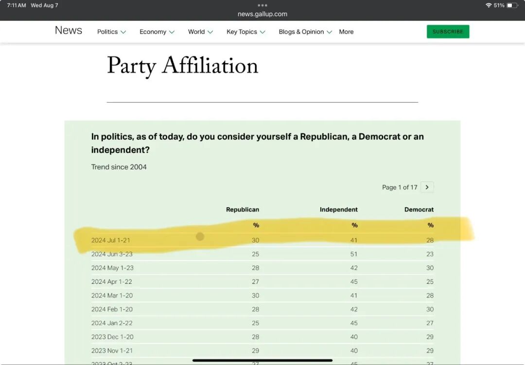 但根据著名的Gallup民调,美国人在2024年的党派分布是:28% 民主党41% 独立选民 30% 共和党