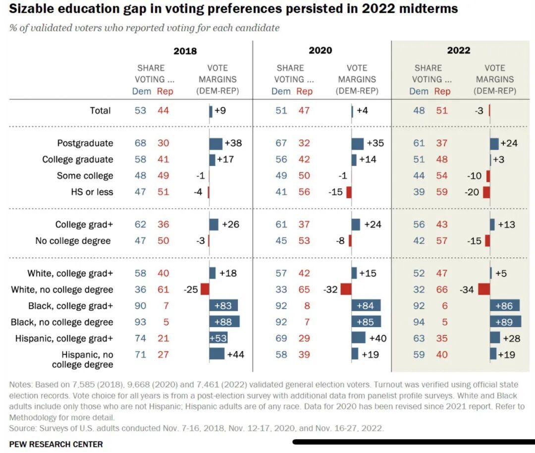 比如两党在不同受教育程度的人群里,支持率差异很大(共和党59% vs 民主党39%,来源皮尤中心)。这意味着,如果民调多采访受教育程度高的大学及以上的人群,减少采访高中文凭及以下的,那么很容易虚高哈里斯的支持率,得到对民主党有利的结果。