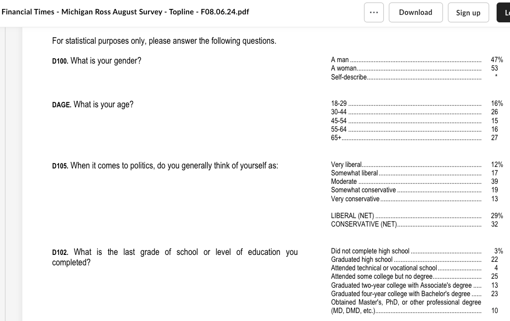 笔者也看了一下,这方面确实存在这个操控,该民调问到的高中以下文凭人数远低于美国人群这方面的自然分布比例。