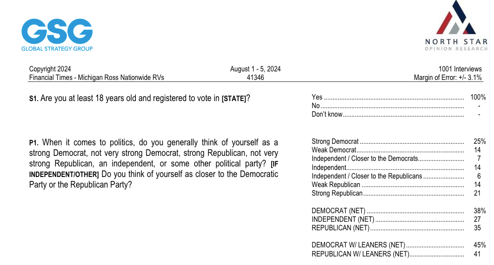 媒体和民调机构这么耍花样舞弊是家常便饭,再看这个7月底YouGov的民调。左倾的民调公司通过多抽样民主党注册选民(N=570),少抽样共和党注册选民(N=397),自然得到有利于民主党的统计结果,从而制造了当时的所谓“哈里斯领先川普2%民调“的宣传说法。