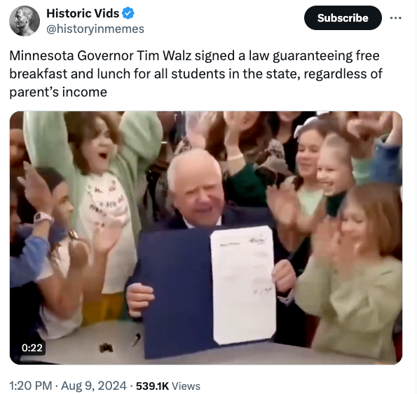 他最引以为豪的立法,除了那个变性方面的,都是类似于那种共*主义大锅饭性质的。比如最近的一个立法就是公立教育所有早中餐免费, 由州政府提供拨款。这种公社大食堂的做法,在我们这些经历过文革的中国人看来,其实长期运作下去,结局很难说。政府的合同浪费很多,实际上餐饮质量很难保证,另外政府长期的拨款随着通货膨胀意味着纳税人的负担将越来越高。纳税人本来就负担贫困家庭的学校餐饮,现在这种校餐扩大化,还要负担与此而来的庞大的行政费用,和不可避免的腐败,社会成本其实远远大于家庭自己负责孩子的校餐。至于为什么提到腐败,下面我会具体介绍发生在 Walz期间的一件全国最大的利用学生餐贪污的案件。