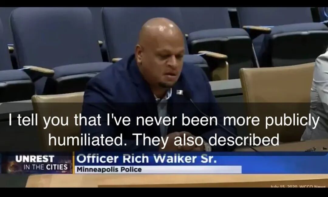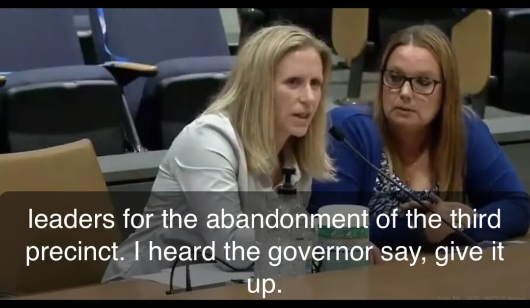 (“我听到州长说,放弃吧。虽然这话不是直接对我说的,而是通过电话传达的。州长说,放弃警察分局。我是说,这对整个州来说都是一种打击“。三位警官描述了一个士气低落的警察队伍,几十名警官计划退休或辞职。“我相信我代表了每一位明尼阿波利斯的警察,我告诉你,我从未感到过如此公开的羞辱”(这是另一位男性警察的声音),他们还描述了一个失控的城市:“犯罪现在在明尼阿波利斯猖獗。”)
