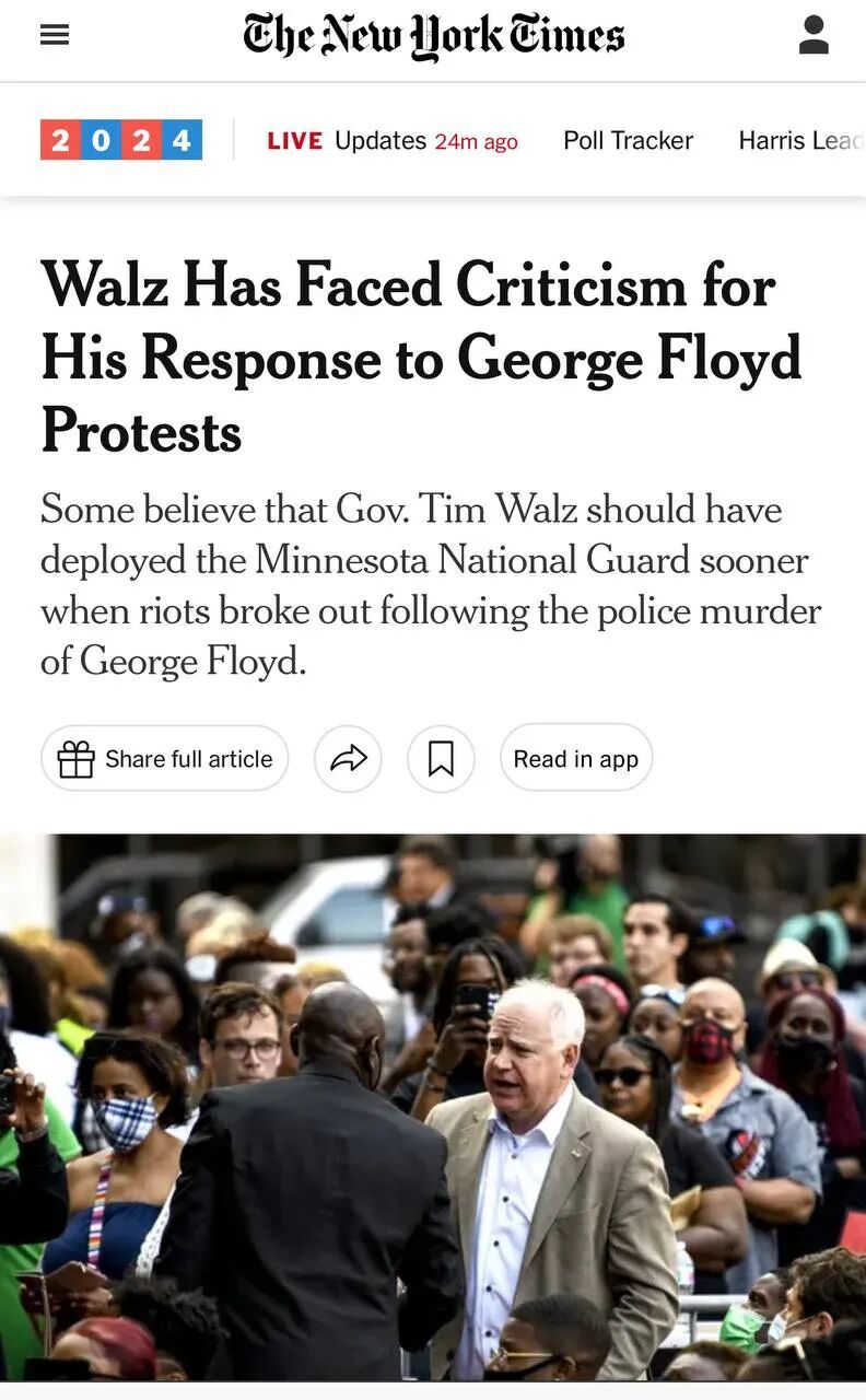 Tim Walz始终处于犹豫状态,不愿意调动明州国防警卫队去阻止暴动。他在明州警卫队赴伊拉克战场前当了逃兵(点击🔗前文),自己也不敢调动明州警卫队。最近甚至连自由派的《纽约时报》都加入到对Tim Walz的批评声浪中,我怀疑Tim Walz没有及时调警卫队与他的政治正确的哲学相关。