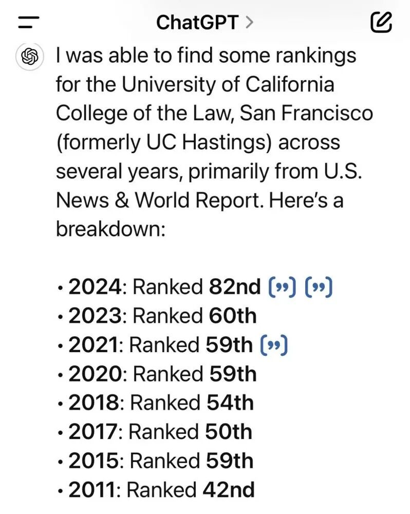 Hastings法学院排名82,伯克利法学院12,Hastings的排名在前面十几年都是在42-82之间。Hastings可能太烂,去年把名字改得好听点称为旧金山加州大学法学院,University of California College of the Law, San Francisco。弄得好像是很prestigious似的, 类似UCSF作为UC系统的医学院或者Davis作为UC的农学院,其实他们这样改是为了揩UC的油。这名字也十分奇怪:“College of the Law”而不是“School of Law”, 加个定冠词似乎让人觉得他们只是研究特定的法律,恐怕涉及旧金山如何管理毒品或者无家可归者。美国只有一百多所被美国的Bar委员会认可的法学院,排名第82名的Hastings甚至连我们的SLU(圣路易斯大学)法学院的79名都不如,我们华大法学院排第16名。哈里斯在Hastings法学院读懂了美国宪法和宪法修正案没有?在她的新政里拥有一些很荒唐的提议,我希望它们永远不要被实施。她怎么弄出个每位新买房的人国家应该补帖$25,000,这要将美国的国债催到多高?这对不买房的人多么不公平,况且买房是享受高质量的生活,凭什么纳税人出钱让有些人享受没有挣来的人生?这也几乎涉及到使用公款买选票的行为,罗姆尼当时败选后就有些感慨,因为当时将年轻人的健康保险在父母名下延长至26岁,他败选后抱怨奥巴马通过此手段买断了年轻人。哈里斯占尽便宜却读不了好大学,本科和法学院都不入流。那么是否因为她们家对学校的牌子不在意?肯定不是。她的父母都是重教育的高级知识分子,都拥有加州大学伯克利分校的博士,她的父亲还是斯坦福的经济学教授。她的妹妹是从伯克利本科和斯坦福法学院毕业的,落到哈里斯身上,恐怕她就是一个读不好书的人。她确实是个Street-smart的人,可以在民主党的全国代表大会上公开对拜登说:“我爱你!”。那么拜登怎么回报呢?据说他讲完话就会去加州度假,根本不会现场听哈里斯的接受总统提名的演讲。也就是说,民主党最高民选人物将会缺席大部分的党代会,我不知道这是否为记录?