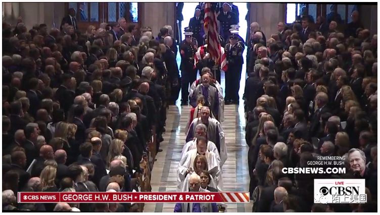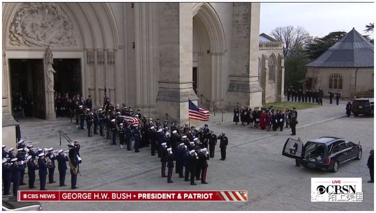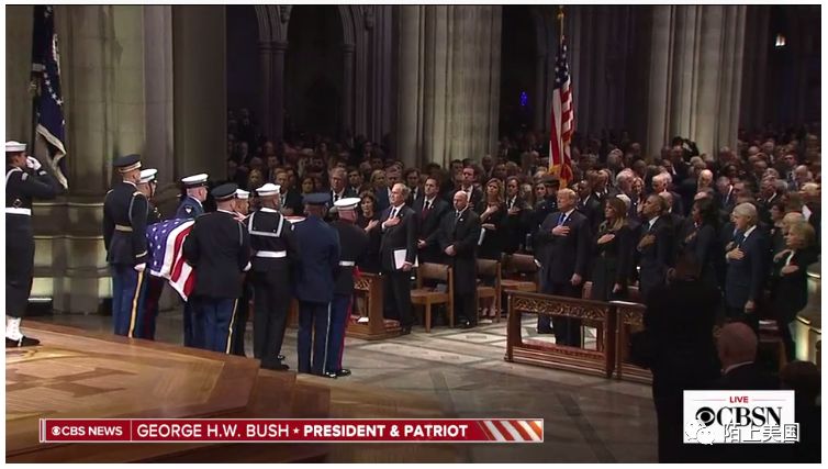 美东时间十一点整,老布什总统的灵柩被三军将士护送进入,国葬正式开始。