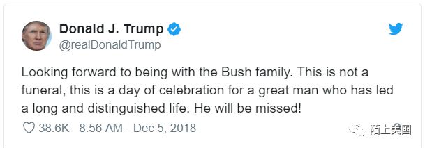 “期待今天见到布什一家人。 这不仅仅只是一个葬礼,而是庆祝一个伟大的人悠久而卓越的一生。他(前总统老布什)会被铭记!”