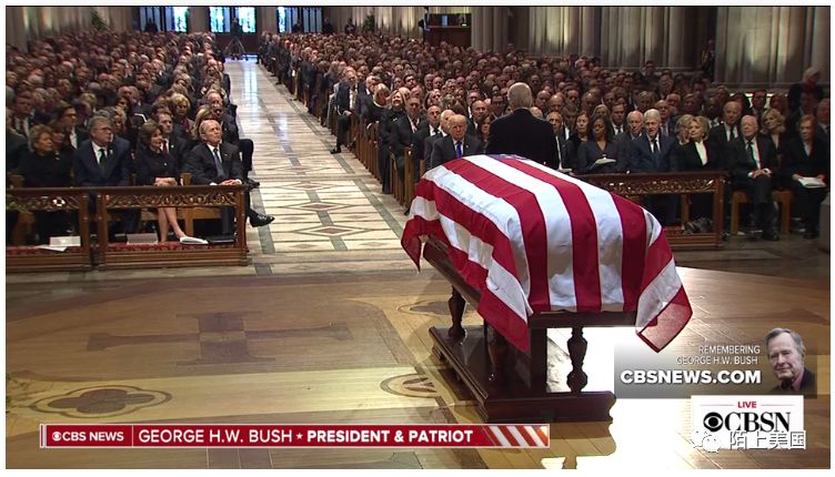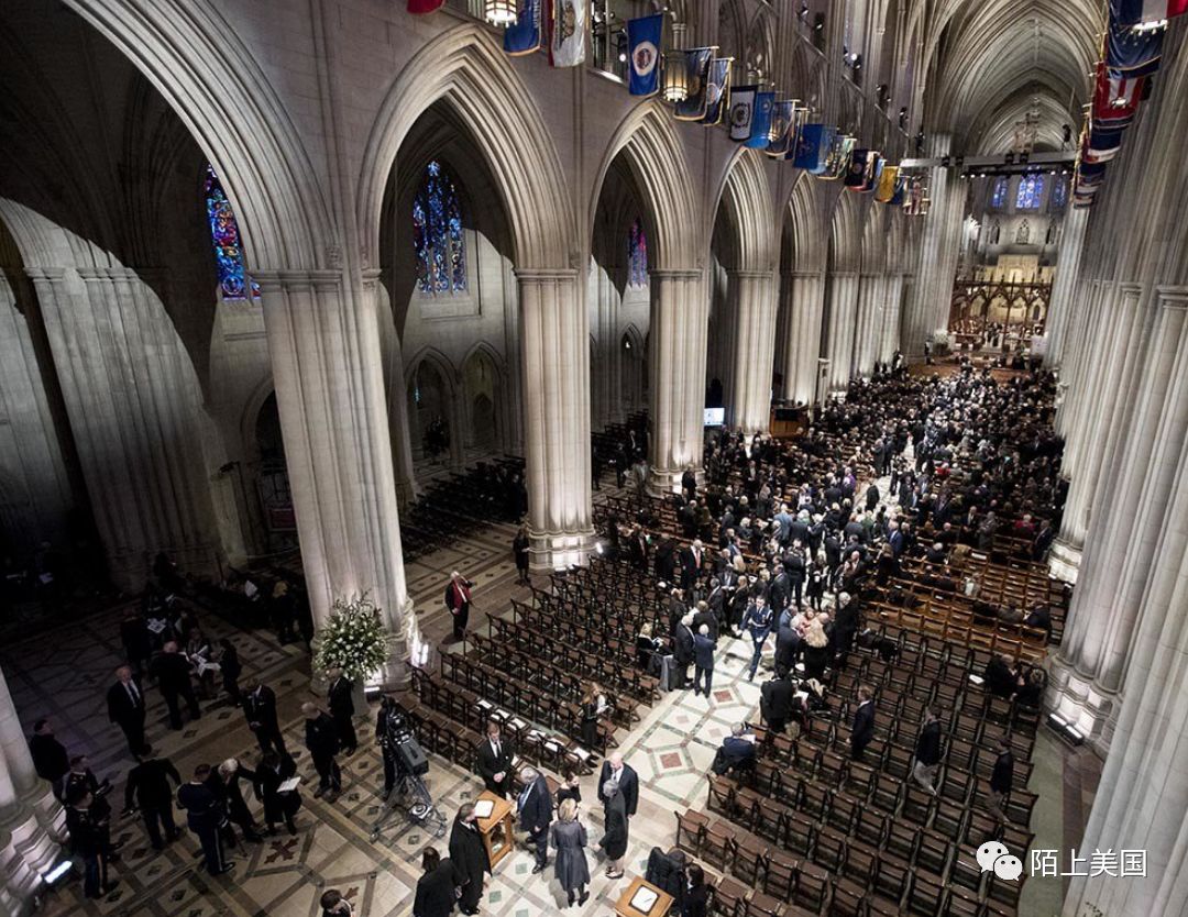 12月5日周三,也成为美国的国家默哀日,政府和许多公立机构关门一天。清早,出席葬礼的人员进入华盛顿国家大教堂,陆续安坐就绪。