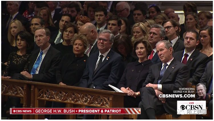 布什大家庭的主要成员出席葬礼,前排从右到左分别是小布什夫妇,杰布·布什(Jeb Bush)夫妇,尼尔·布什(Neil Bush)夫妇。