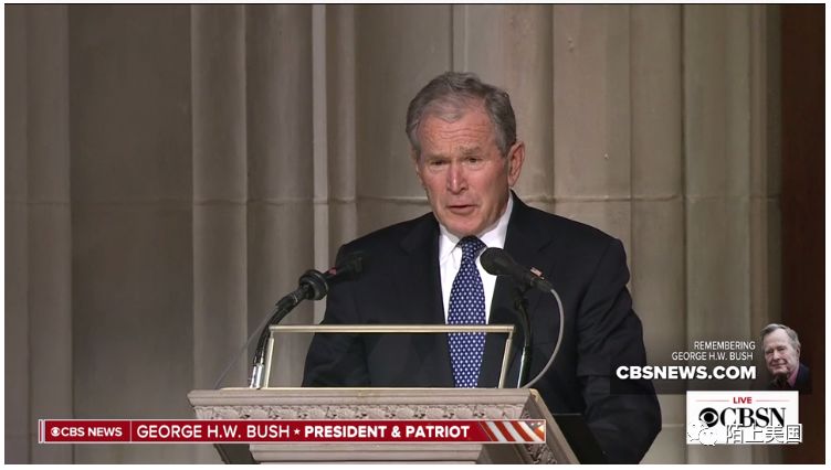 小布什作为布什家庭成员,长子,和第四十三届总统,给自己的父亲老布什致悼词。这两个是罕见的父子总统二重奏之一。他说:
