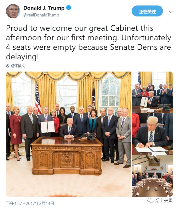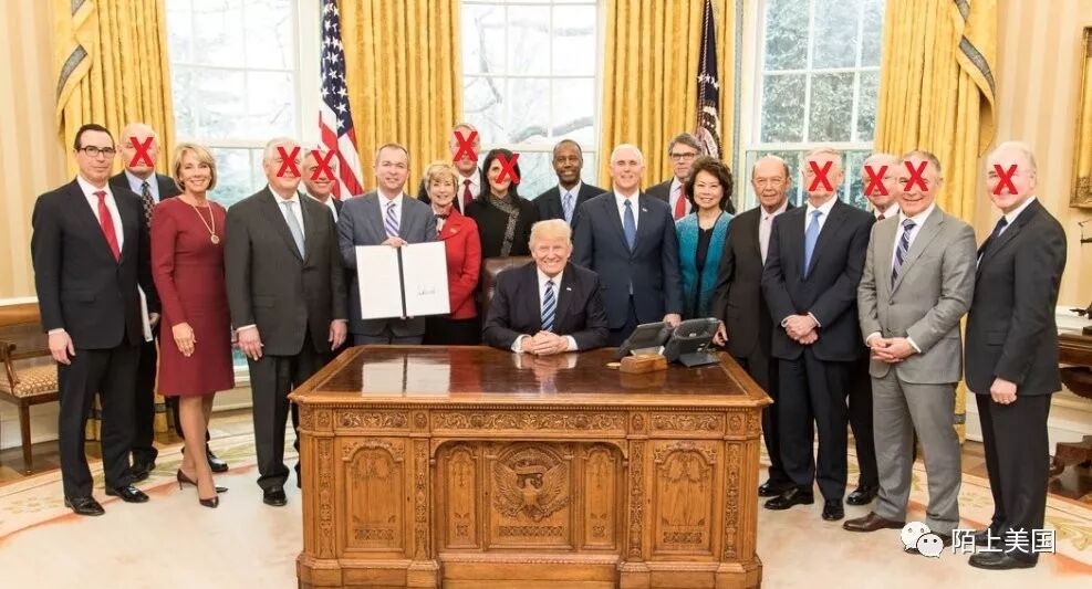 这是川普第一次内阁会议的合影,当时是2017年3月13日。在本届白宫开始上班时候,总导演川普满怀喜悦地宣布,这一届内阁是美国历史上最强的之一。