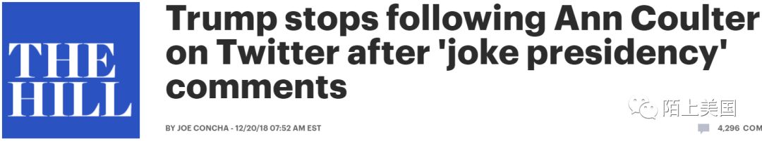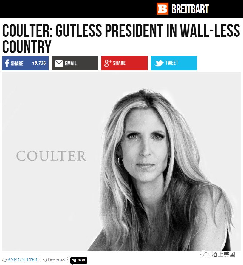 除了朝堂,白宫外围的民间,最近给川普众叛亲尚未离添砖加瓦的人也是不少。比如右翼专栏作者兼媒体人,“墙粉”安·库尔特(Ann Coulter)在著名的保守派民粹大本营媒体上写文大批川普。之后又说: