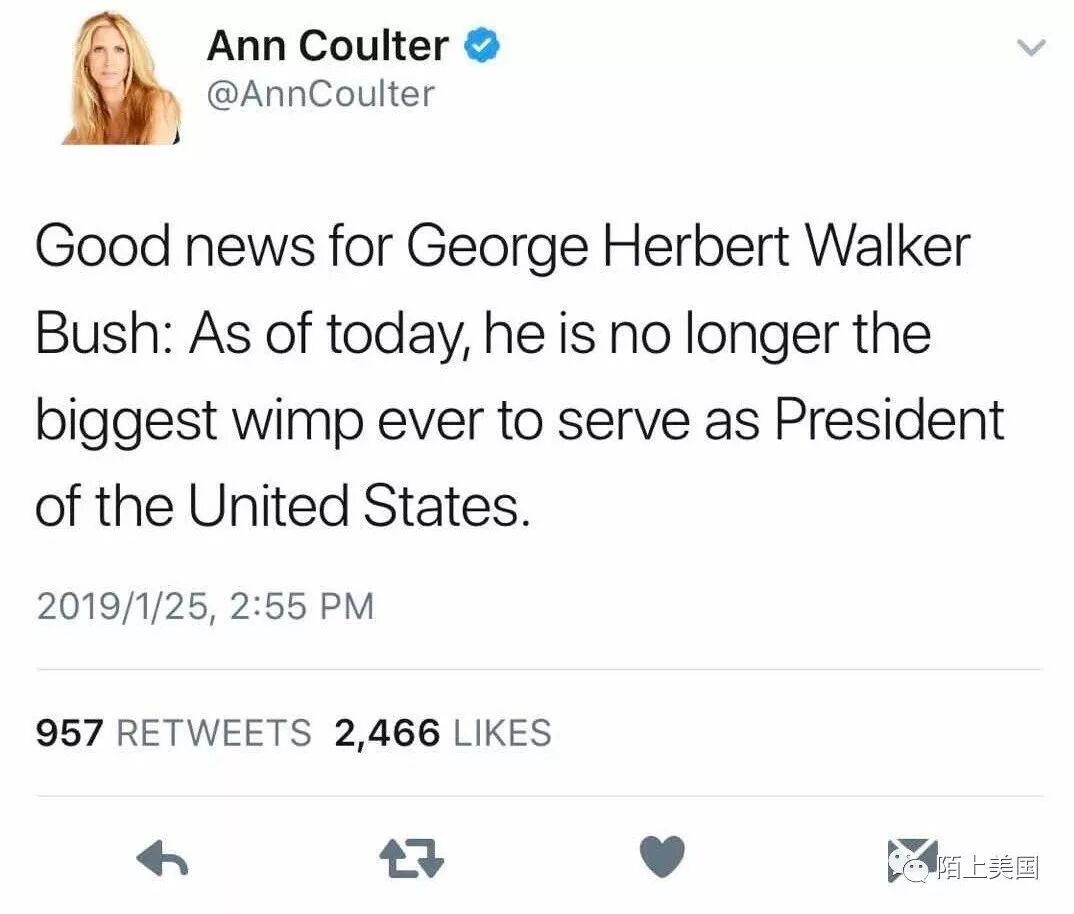 不过跟Ann Coulter姐给川普的神补刀一比,麦康纳尔被说的这句真不算个事。Coulter这位坚定的墙粉,放言把川普列为比老布什排名还要高的“第一窝囊废总统“。