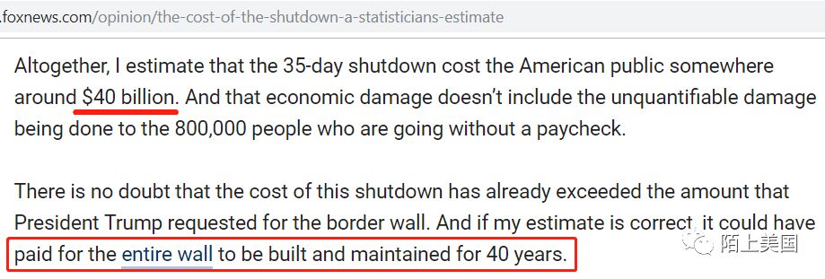 不过,这场政府关门的大戏,真正买单的是我们纳税人。根据福克斯新闻的一篇观点文章分析,因为政府关门35天,国库损失400亿美元。等于每个美国人赔120美元,这笔钱也相当于可以修计划中的墙并维持使用40年了。