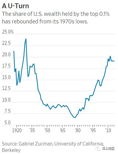 从伯克利大学的教授加布里埃尔·祖克曼提供的研究分析看,美国从上世纪20年代开始,在过去的一个世纪内,最富裕的0.1%人群手里的财富,恰好经历了一个U型曲线变化。