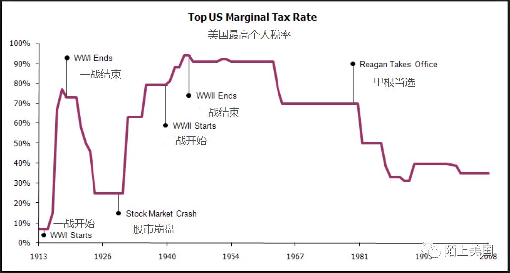 再看一下每个时期对应的美国最高个人边际税率,则又会发现一个惊人的规律。