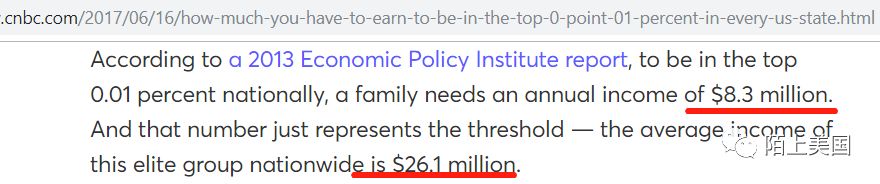 根据一个经济政策智库在2013年披露的数据,意味着全美范围内,家庭年收入达到830万美元的入门线。而这个巨富精英群体的平均家庭年收入,是2610万美元。