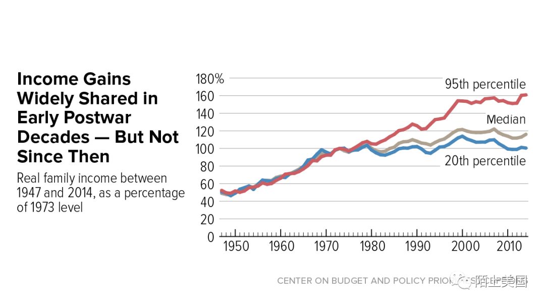 另一个来自预算和政策研究中心的统计,以1973年的水平作为标线,对比了最富裕的5%美国家庭 vs 中位数收入美国家庭 vs 底层20%低收入的美国家庭从1947年到2014年的财富变化。