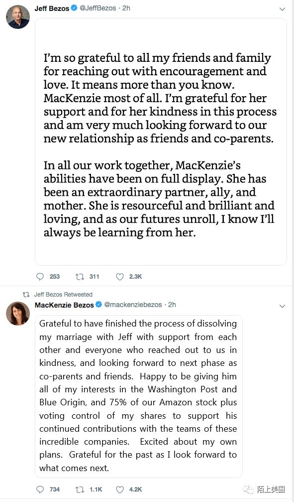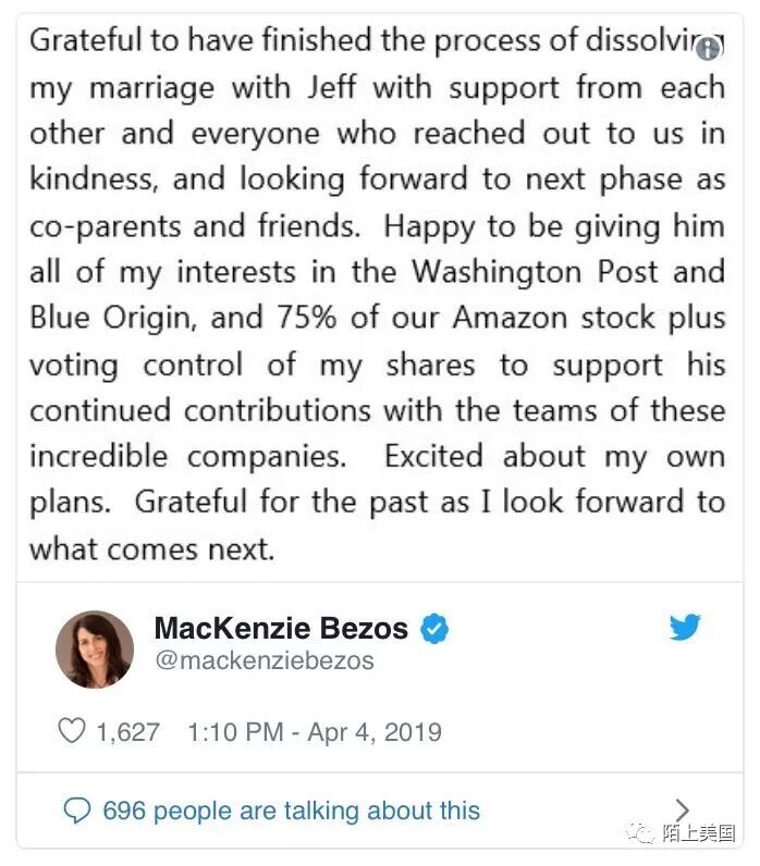 我很高兴地决定把《华盛顿邮报》和太空探索公司蓝色原点的所有股票,以及我们婚前持有的亚马逊股票的75%和剩下我所有的亚马逊股票的控制权都归杰夫所有,这是作为对他为这些令人难以置信的公司的贡献的一种继续支持。我对未来的计划和生活充满希望。”