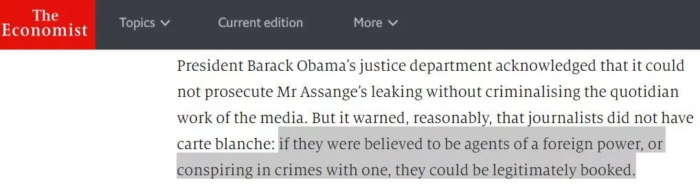 其次,媒体人报道新闻没有超越一国法律的特权。美国司法部指控阿桑奇有帮助美军一等情报兵曼宁一起解密五角大楼密码,冲破国防信息防线,获取军情的行为。这些罪名如果坐实,已经严重越线了记者的常规。媒体人虽然一贯积极采取一切行动获得新闻消息,但是越线法律冲击国家安全的话,则性质完全不同。在奥巴马总统任期期间,美国司法部就有提到:如果(媒体或者爆料方)被发现是外国势力的代理人,或者一起密谋犯罪,他们将被法律严惩不贷。