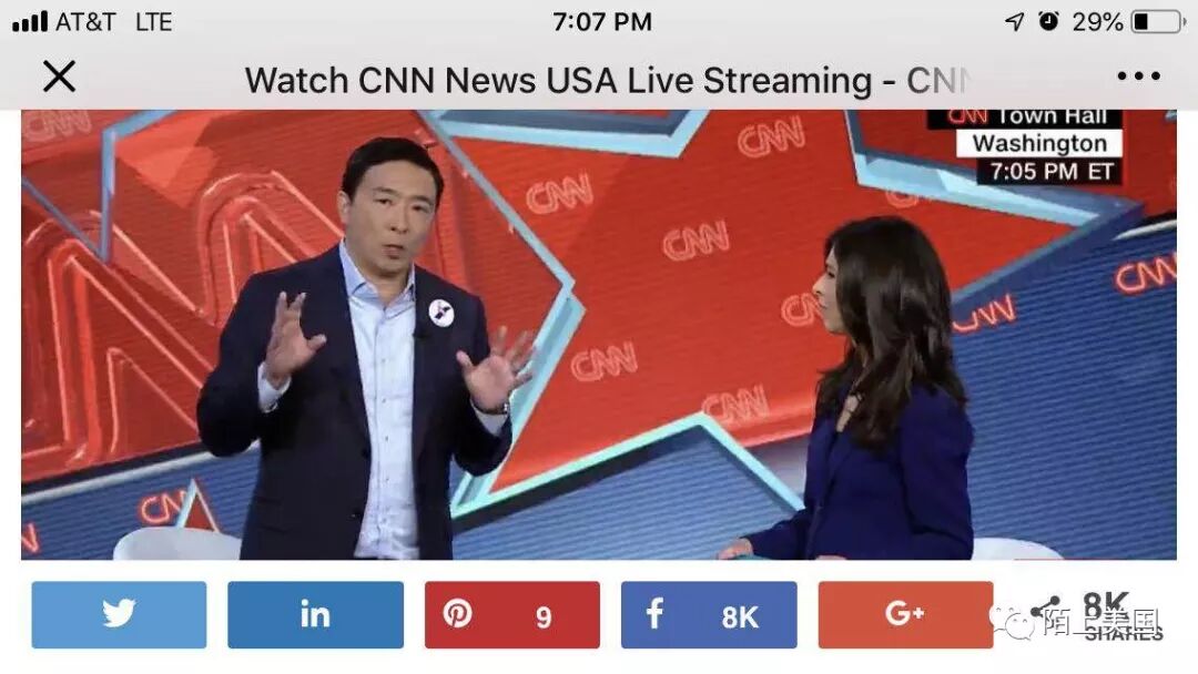 4月14日,美国东部时间晚上7点,精神抖擞,充满自信,身型高大的杨安泽首度出现在CNN主持的Town Hall(类似于市政厅议会)上。这是美国总统竞选中,候选人向全国选民通过电视直播讲述自己的政治理念的一种传统的形式。