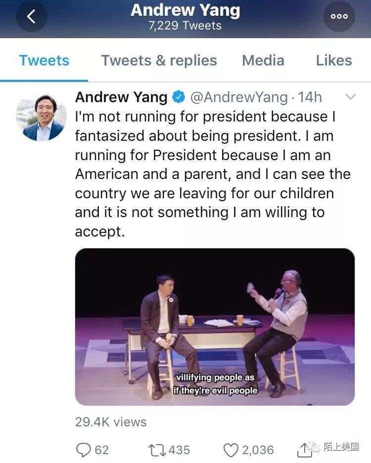 杨安泽在推特上说过,他不是因为对总统大位(权利)的着迷而出来竞选总统,作为一个美国人、一个为人父母的人,他觉得国家在往他担忧的错误的方向走,他需要通过竞选总统做出贡献和改变。
