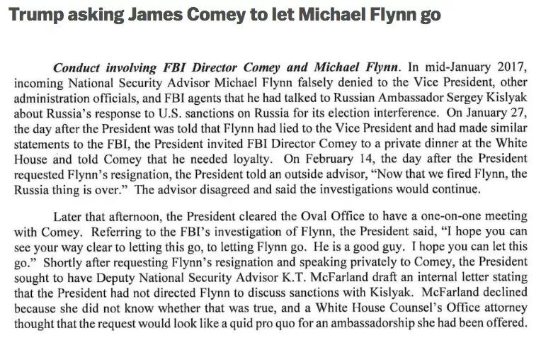2017年一月中旬,新科总统国家安全顾问弗林将军,向副总统和其他政府官员和FBI说了不实之词,否认自己和俄国大使商讨制裁问题。1月27日,特朗普得知了弗林撒谎后,邀请FBI局长科米赴白宫私人宴会,要他表忠心。2月14日,在总统要求弗林辞职后,他对一个助手说:“我们把弗林开了,通俄的事也就没了”。助手说:哪有辣么简单!