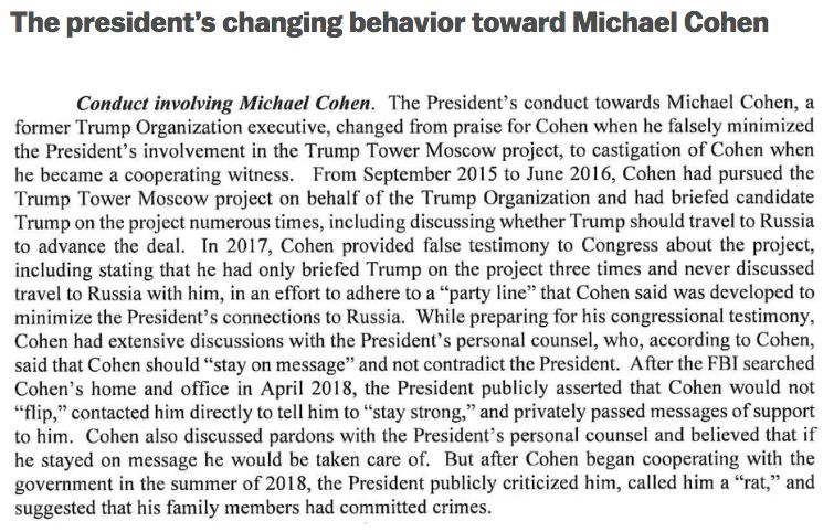 后来FBI查抄了科恩的家,总统公开表态,坚信科恩不会叛变,直接和他联系,鼓励他“要坚强”,并私下传话以表达支持之意。科恩和总统律师也讨论了特赦的问题,并相信如果自己守口如瓶,必然能得到妥善待遇。但是,科恩后来在2018夏和政府合作了,总统开始公开骂他,称他为”老鼠”,说他的家人也犯了罪。