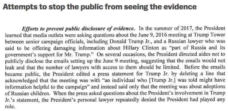 在电邮曝光之前,特朗普审阅了儿子发表的声明,看到里面有一句话承认了这个密会的目的是与会的俄国人提供希拉里的黑料,就命令删掉这一句,转而说这个会是和俄国人讨论收养俄国儿童的。后来媒体询问总统对儿子的声明是否知情,总统的个人律师反复地否认了事实。