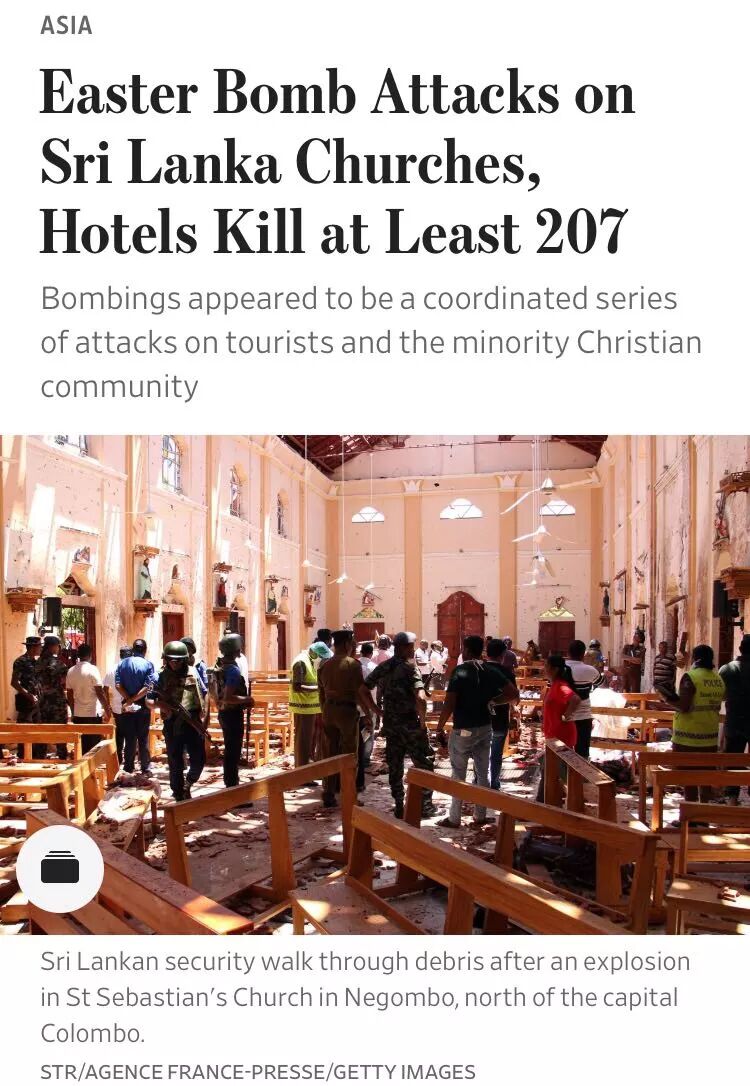 该国首都北部的圣塞巴斯蒂安教堂,是被袭击目标之一。该教堂的一位天主教大主教对华尔街日报记者称,礼拜者的尸体仍散落在教堂周围。爆炸发生时,估计至少有600人在教堂内进行复活节活动。